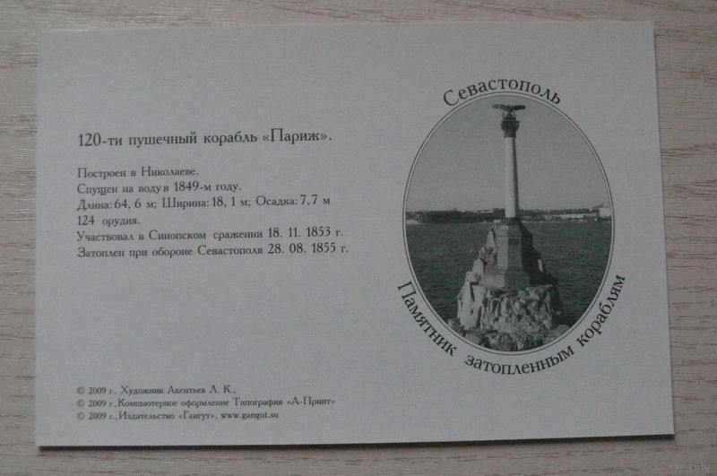 2009; 120-и пушечный корабль "Париж"; из серии "Корабли Российского Императорского флота в Крымской войне 1853-1856 гг."