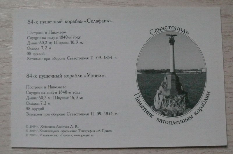 2009; 84-х пушечные корабли "Селафаил" и "Уриил"; из серии "Корабли Российского Императорского флота в Крымской войне 1853-1856 гг."
