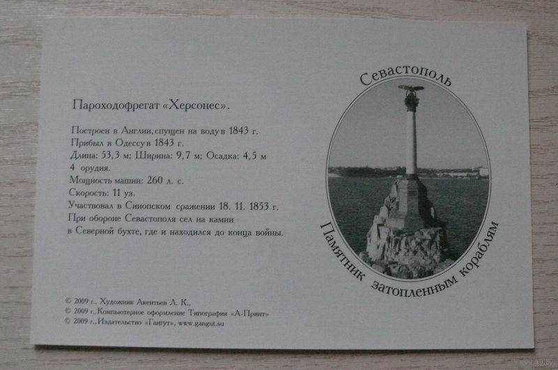 2009; Пароходофрегат "Херсонес"; из серии "Корабли Российского Императорского флота в Крымской войне 1853-1856 гг."