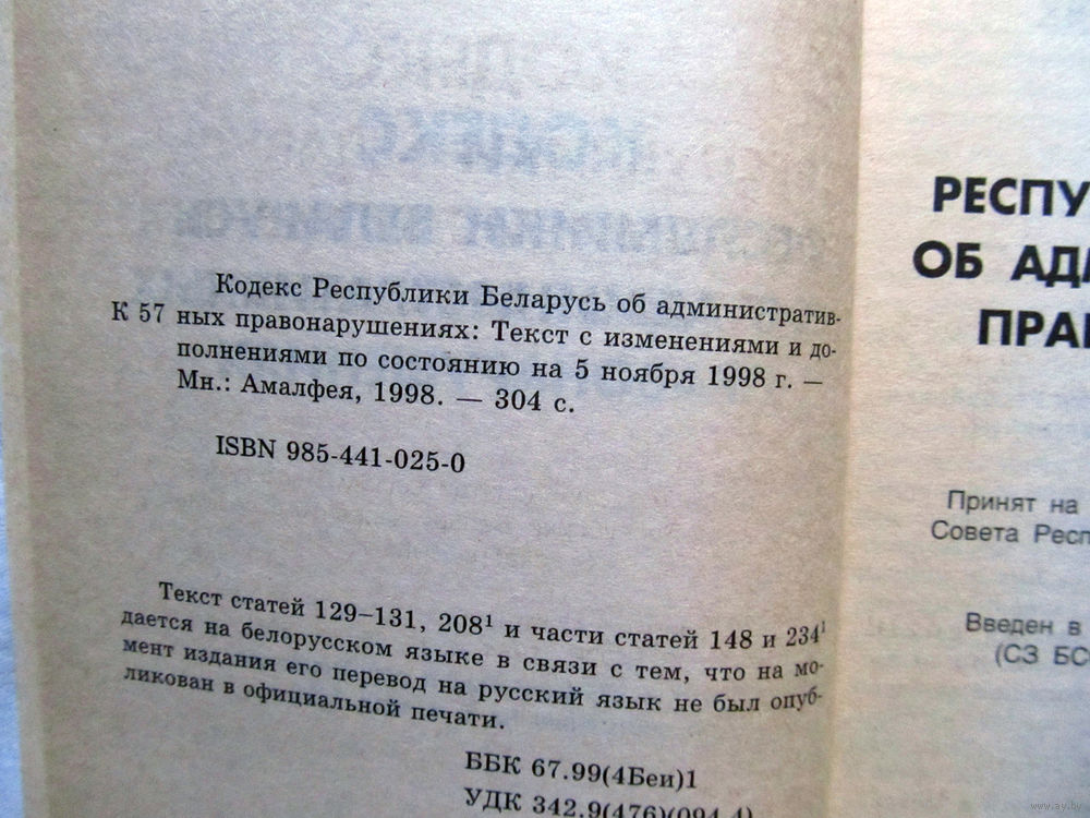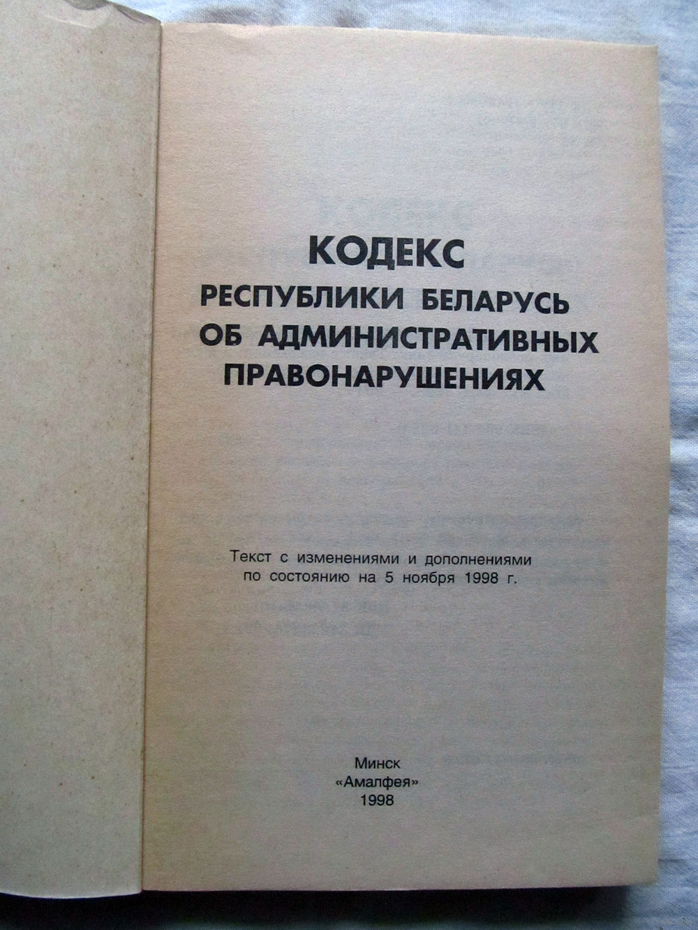 25-33 Кодекс Республики Беларусь об административных правонарушениях На 5 ноября 1998 Минск Амалфея 1998 Частично на белорусском языке – Статьи 129-131, 208, части статей 148, 234