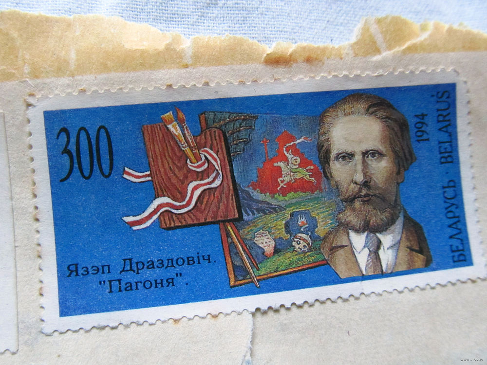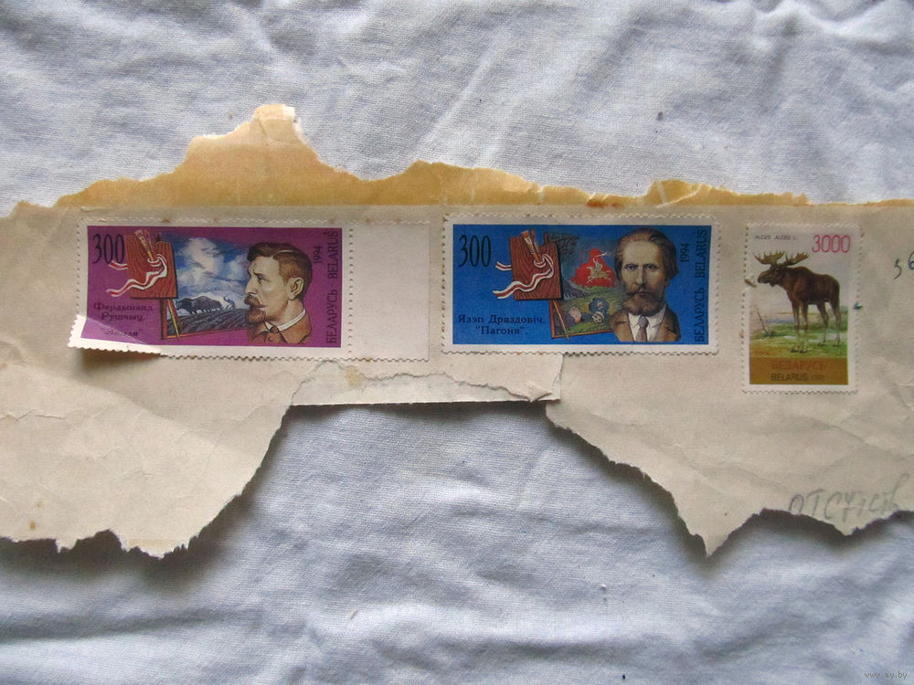 25-34 БК Фрагмент конверта с марками Беларусь Фердынанд Рушчыц Зямля 1994 Язэп Драздовiч Пагоня 1994 Лось 1995