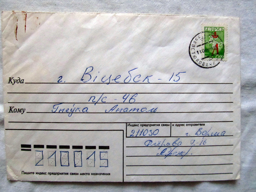 25-34 БК Конверт Подписан Прошел почту Июнь 1996 Марка Беларусь Погоня 1992 с надпечаткой