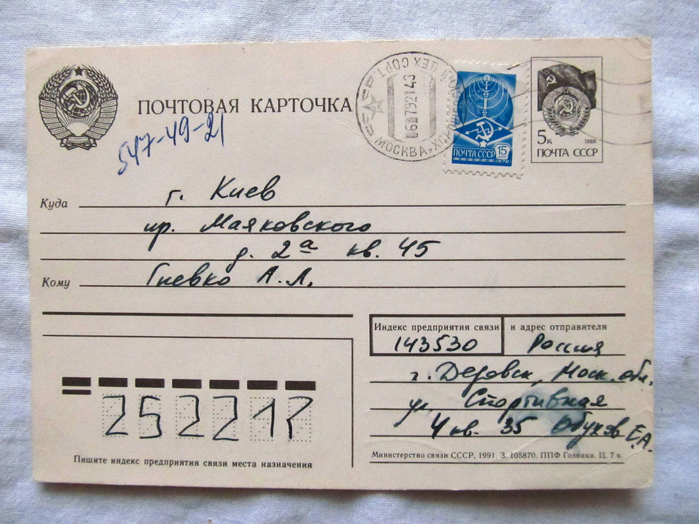 25-34 БК Почтовая карточка Марки СССР Штамп СССР Прошла почту Июль 1992