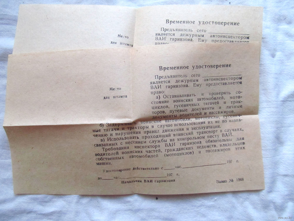 25-34 П1 Бланк Временное удостоверение дежурного автоинспектора МО СССР 1970-е