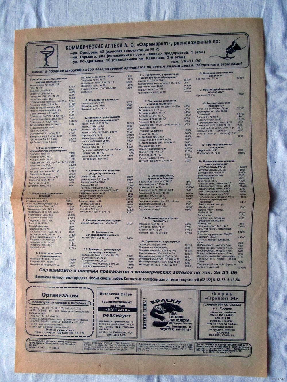 25-34 П2 1142 Газета Рекламное приложение к газате Вiцебскi рабочы Середина 1990-х Полный лист Цены в аптеках Фарммаркет Объявление о продаже на квартире курток и плащей из натуральной кожи от будущего владельца торговых центров Европа, Континент, Мега, Беларусь. С этого все начиналось. Раритет