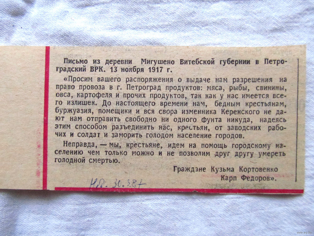 25-34 П2 1249 Газета 30 марта 1987 Вырезка Перепечатка письма крестьян Витебской губернии от 1917 года