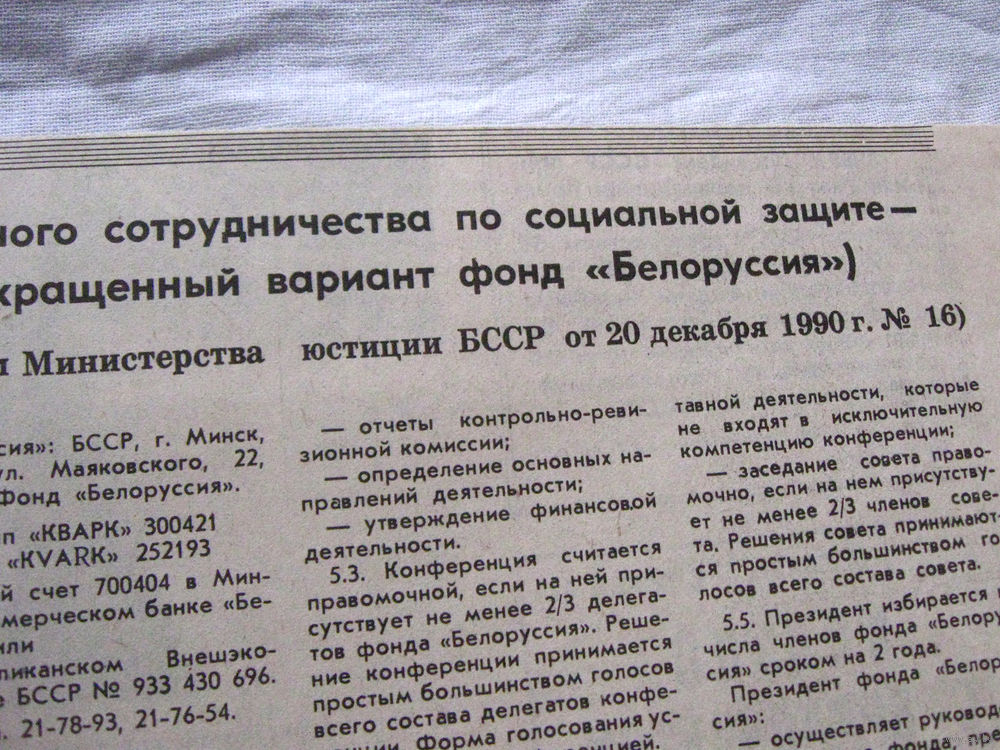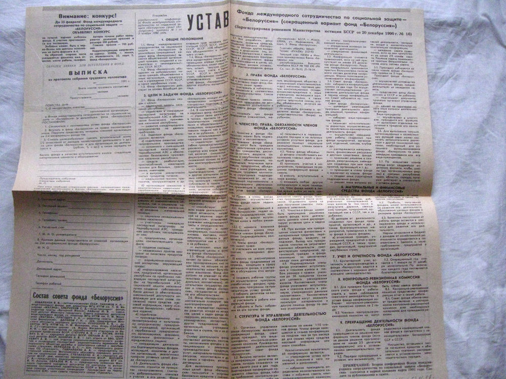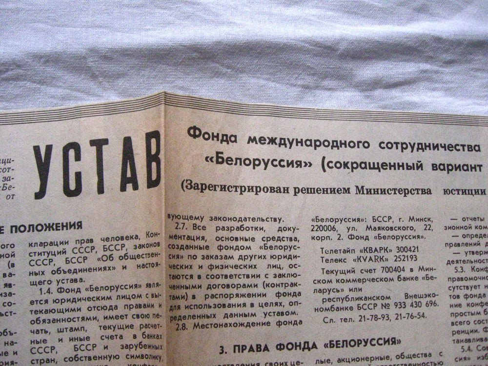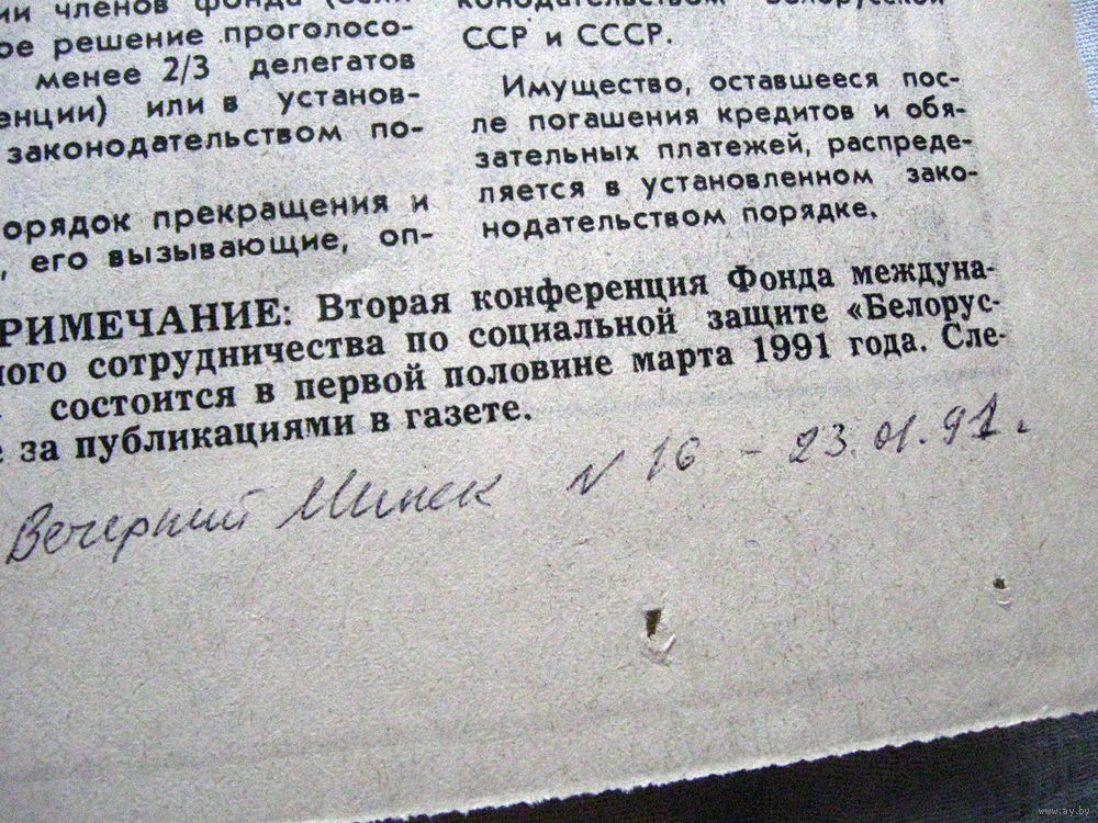 25-34 П4 1-006 Газета Вечерний Минск 23-01-1991 Вырезка Устав Фонда международного сотрудничества Белоруссия