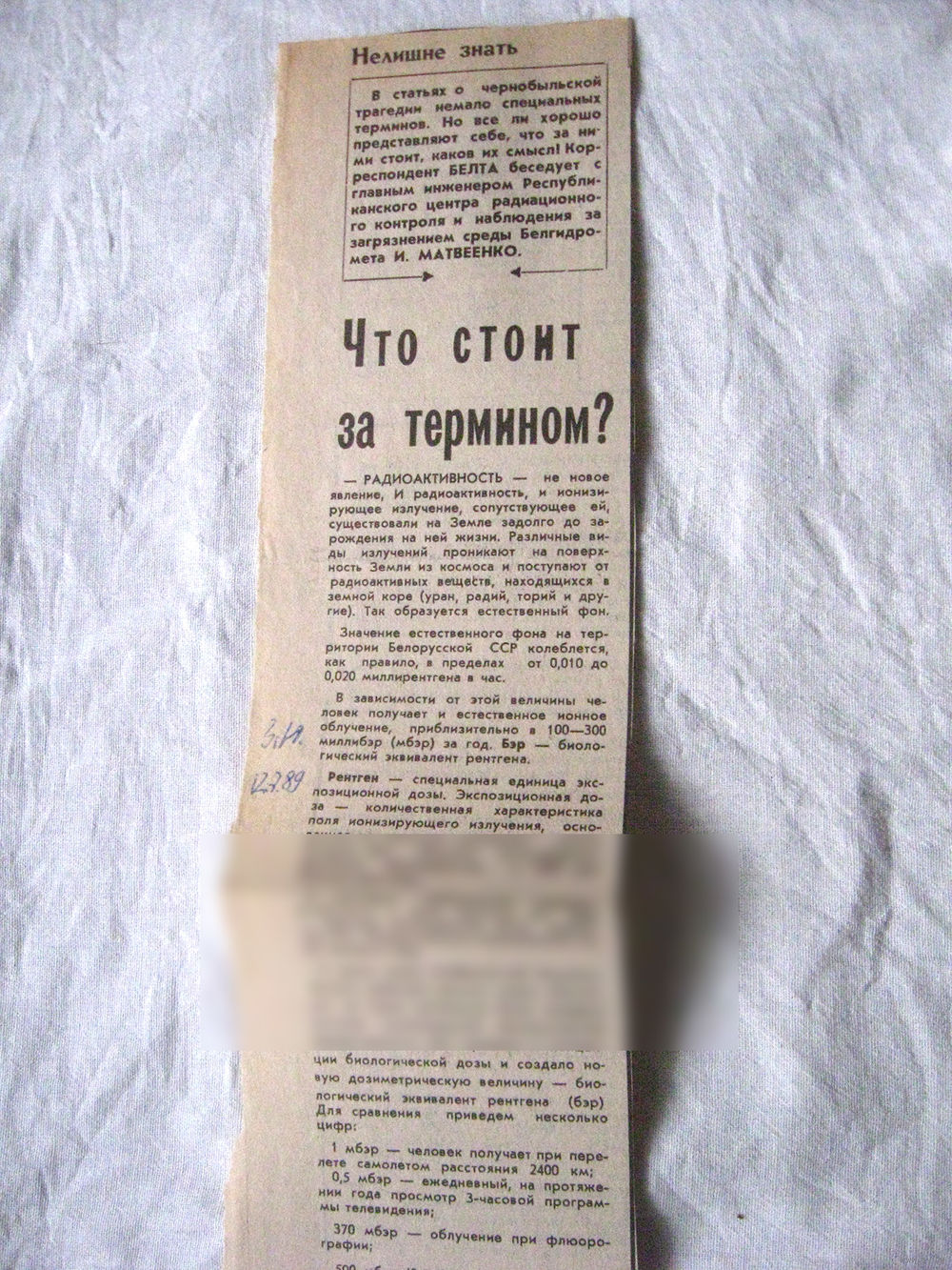 25-34 П4 5-189 Газета Знамя юности 12-07-1989 Вырезка Что стоит за термином? О радиации