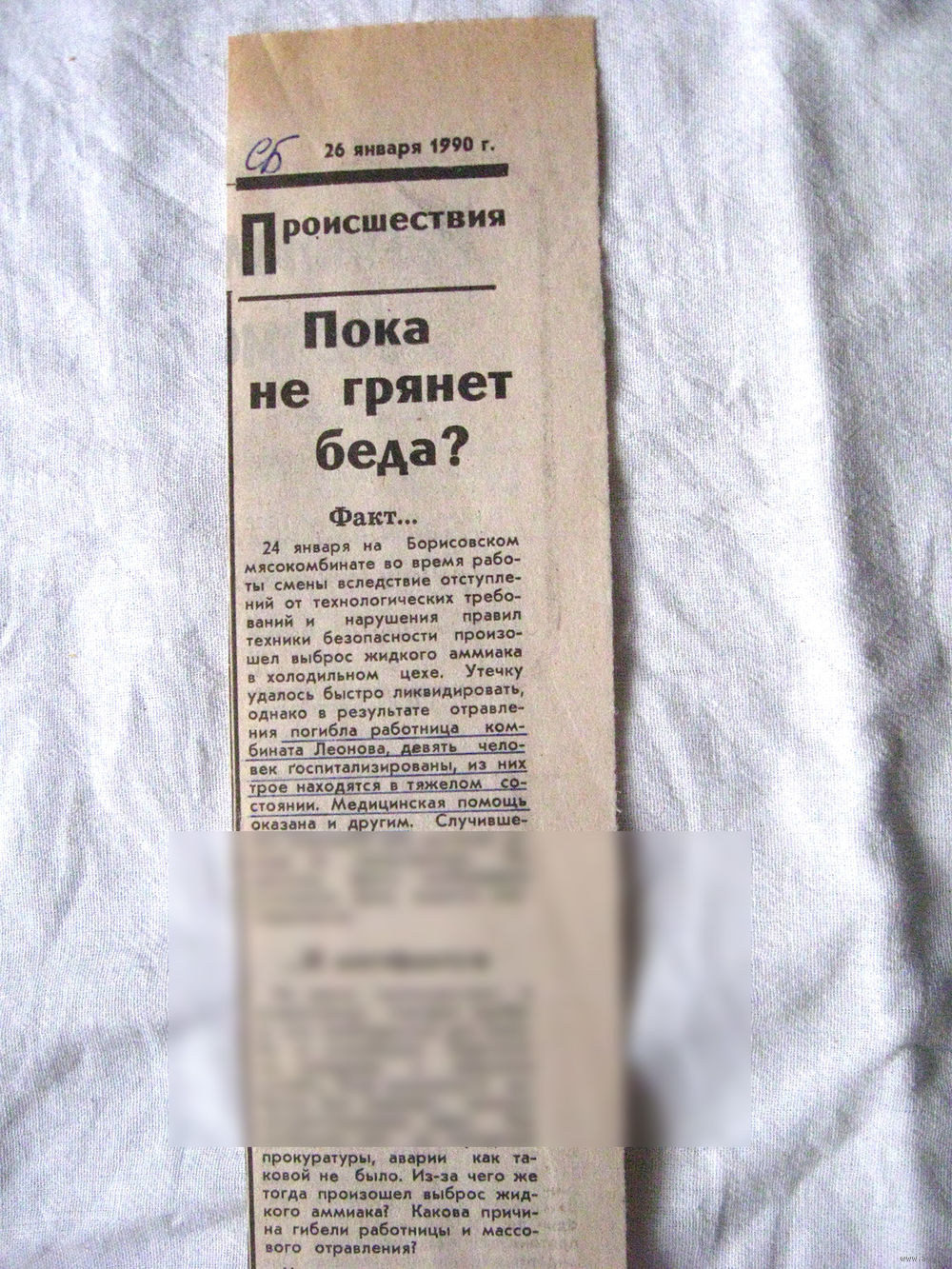 25-34 П4 6-237 Газета Советская Белоруссия 26-01-1990 Вырезка Пока не грянет беда? ЧП на производстве