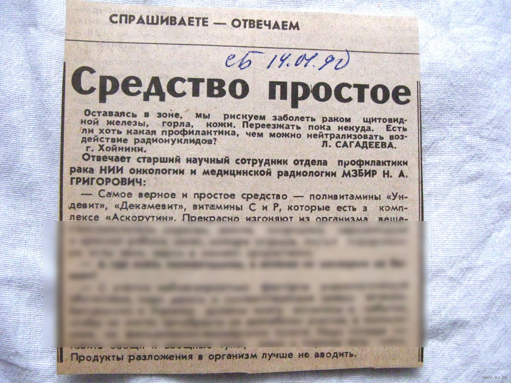 25-34 П4 6-246 Газета Советская Белоруссия 14-01-1990 Вырезка Средство простое ЧАЭС Чернобыль Чернобыльская АЭС