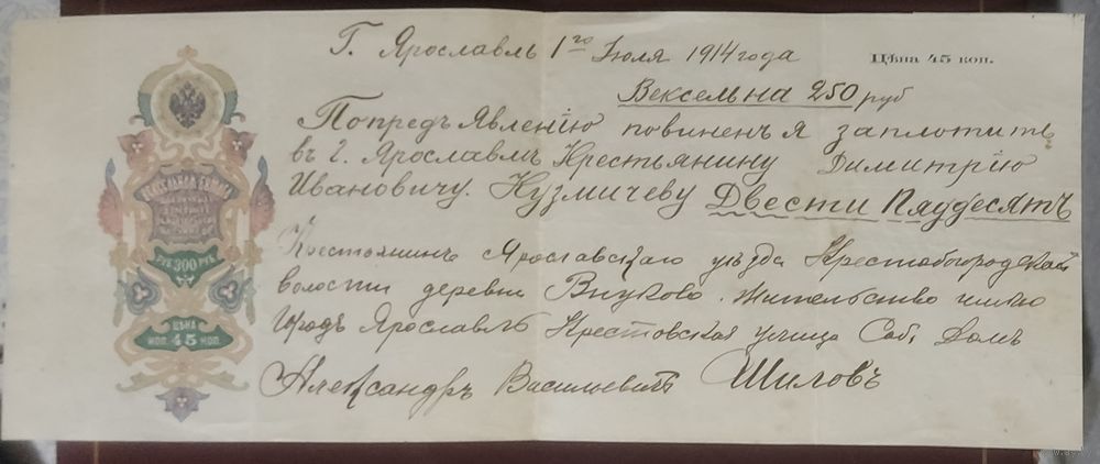 250 рублей 1914 года - Вексель - Ярославль - XF