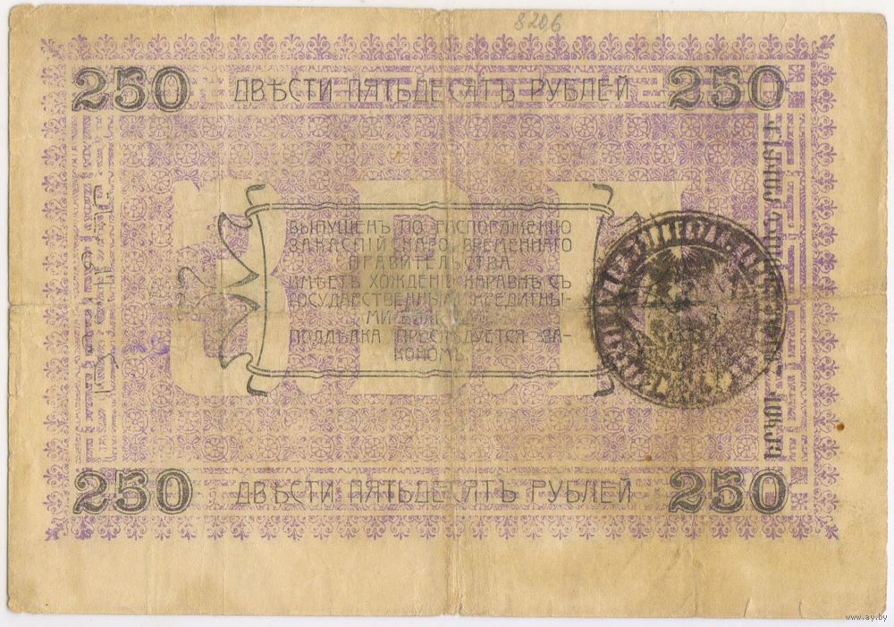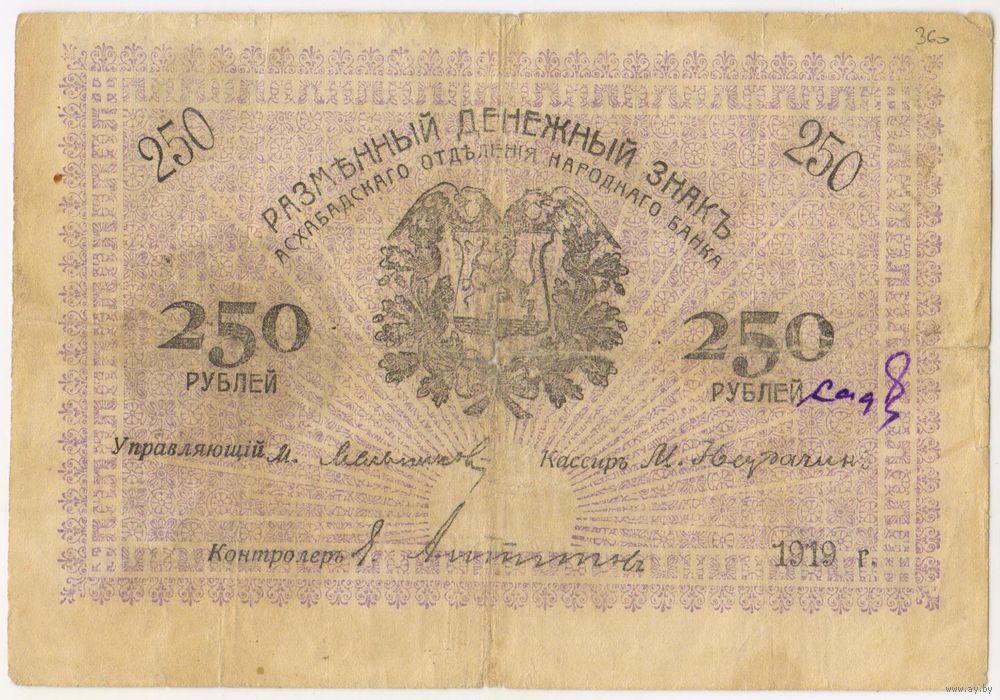 250 рублей 1919 год. Закаспийское временное правительство. Асхабатского отделения народного банка