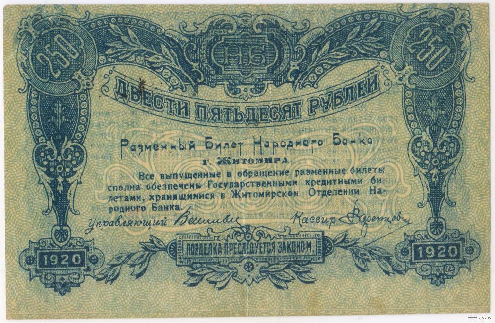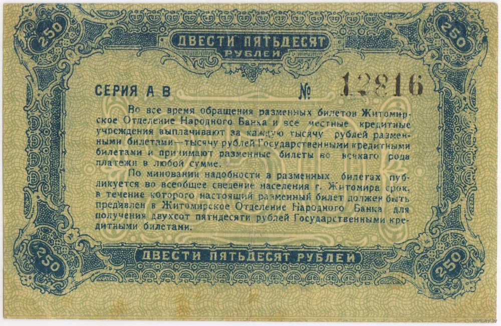 250 рублей 1920 год. разменный билет народного банка. Житомир.. состояние XF!!!