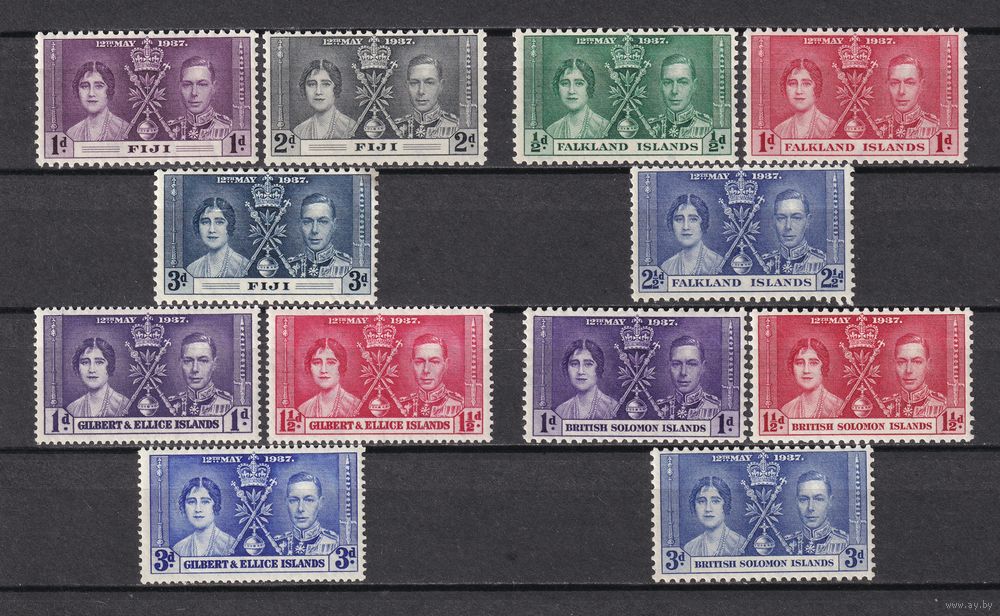27.BrKS. Великобритания. Колонии. Коронация Георга VI и Елизаветы. Океания. Сборный лот. 1937 г. MNH ( без наклейки или следов). На последнем скане пример обратной стороны марок этой серии.