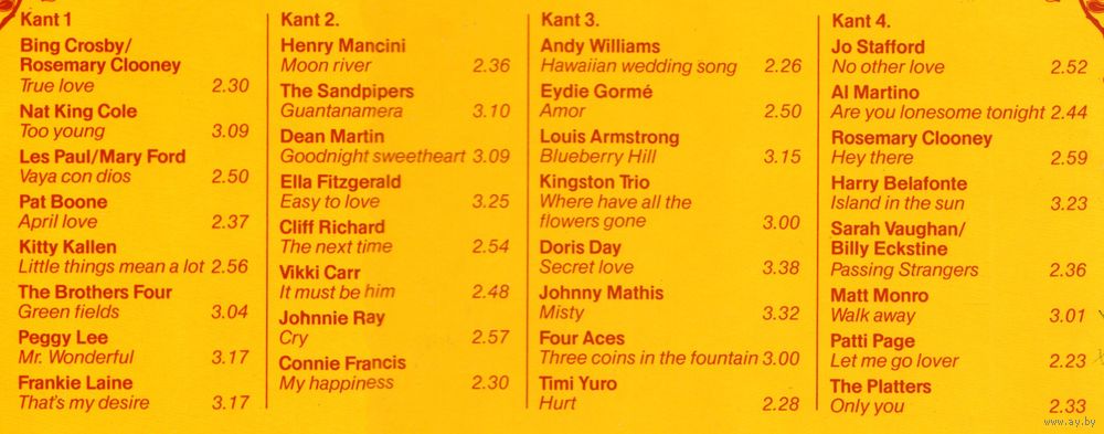 Louis Armstrong, Nat King Cole, Ella Fitzgerald, The Platters, Doris Day, Patti Page, Eydie Gormé, Dean Martin, Andy Williams, Sarah Vaughan, Bing Crosby, Connie Francis, Peggy Lee, Jo Stafford, Rosemary Clooney, Cliff Richard, Henry Mancini, Pat Boone і іншыя