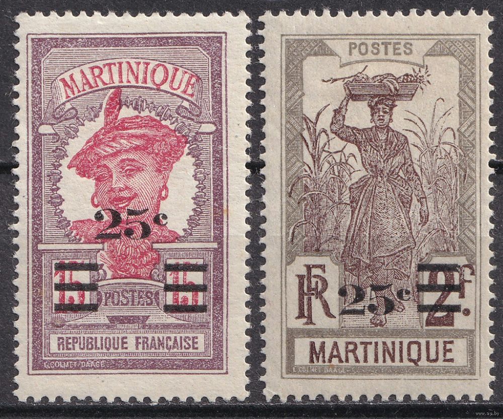 3.FrK. Франция. Колонии. Мартиника. Местные мотивы. Надпечатка нового номинала. 1924-25 гг. Mi.##106-107.
