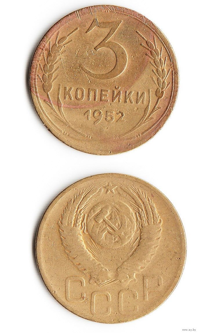 3 копейки СССР 1952 года, состояние отображено на скане.