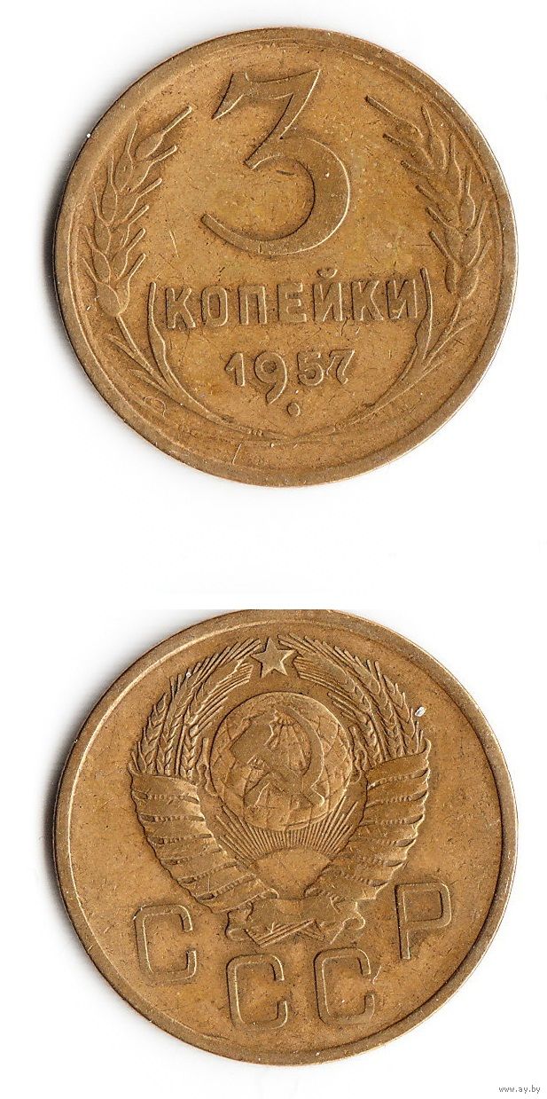 3 копейки СССР 1957 года, состояние отображено на скане.