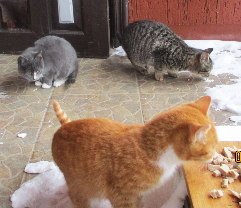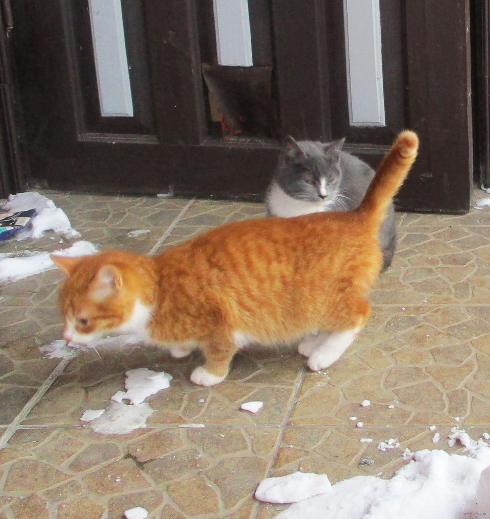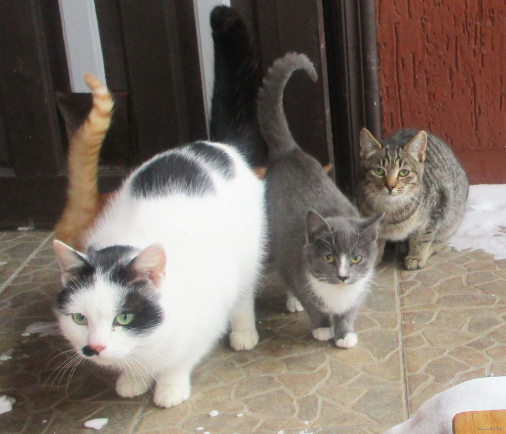 3-4 месяца.Здоровые,пушистые. Рыжий с белой грудкой и белыми носочками.Дымчатый с белой грудкой,пестренький.Большой кот Гитлер. Он за ними присматривает. Себе взяли одного котенка,болше не можем,и так уже 3 кошки. Хотя все очень хороши,тяжело выбрать. Кормим,(про-план или ливерку)но надо как-то перезимовать.20 км от колцевой по слуцкой трассе. д.Басмановка