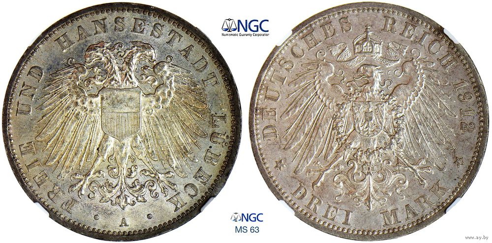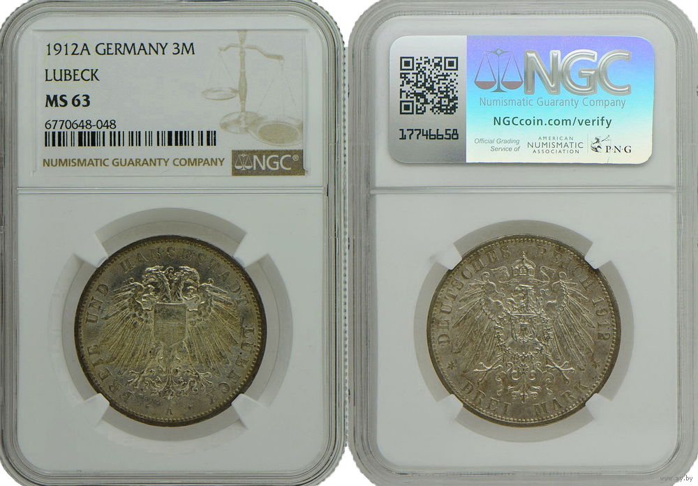 3 марки 1912 г. A. Свободный город Любек (1871 - 1918) Германия. Отличное коллекционное состояние, штемпельный блеск, красивая патина. Монета в слабе NGC, сохранность MS 63. Редкие! Тираж - 33 334 шт. Краузе #215.