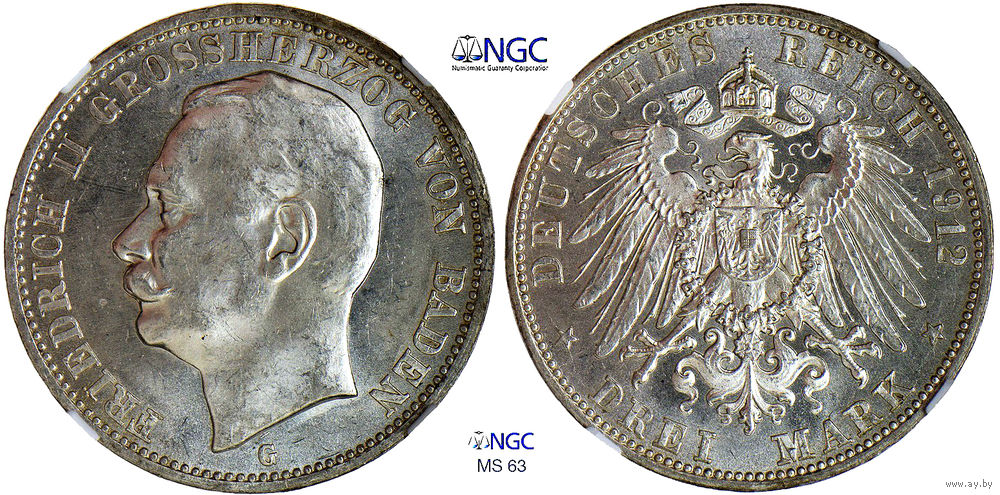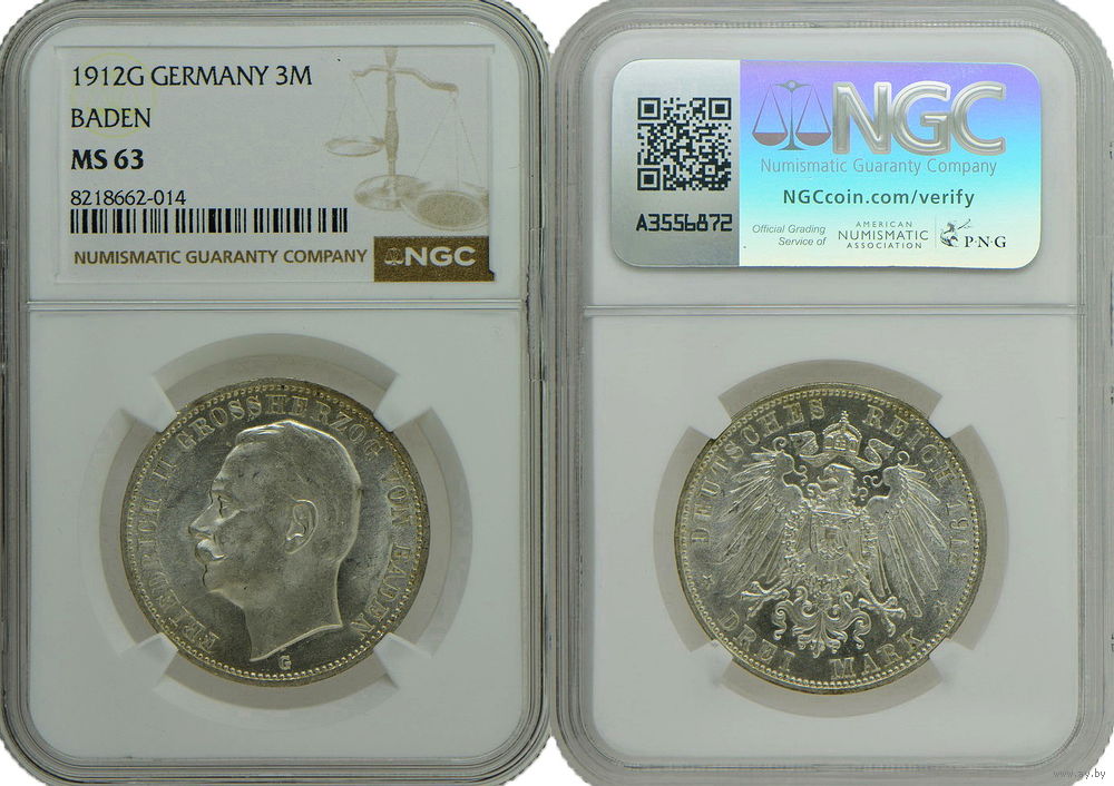 3 марки 1912 г. Фридрих II. Баден. Германия. Отличное коллекционное состояние. Монета в слабе NGC, сохранность MS 63. Краузе #280.