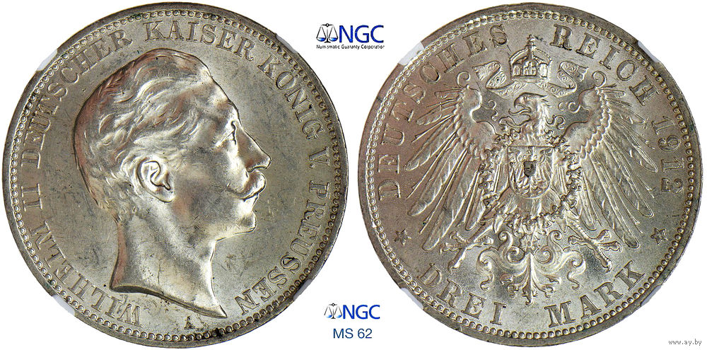 3 марки 1912 г. Вильгельм II. Пруссия. Германия. Редкая в подобном коллекционном состоянии. Монета в слабе NGC, сохранность MS 62. Краузе #527.