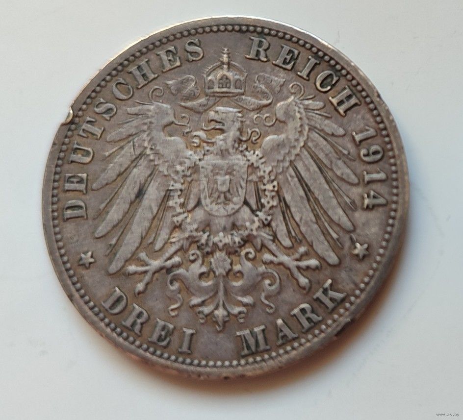 3 марки (Drei Mark) Германской империи 1914 года, с изображением кайзера Вильгельма II (Wilhelm II Deutscher Kaiser König von Preußen).