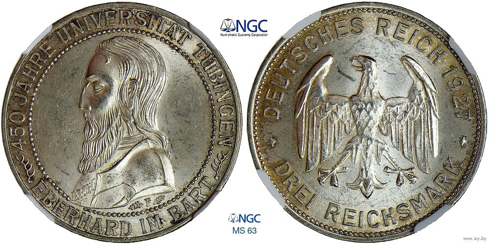 3 марки 1927 г. F. Веймарская республика. Германия. NGC MS 63. 450 лет Тюбингенскому университету. Серебро. Очень редкие. 50 тыс. шт. Редкая монета в превосходном коллекционном состоянии. Монета в слабе NGC, сохранность MS 63. Краузе #54.