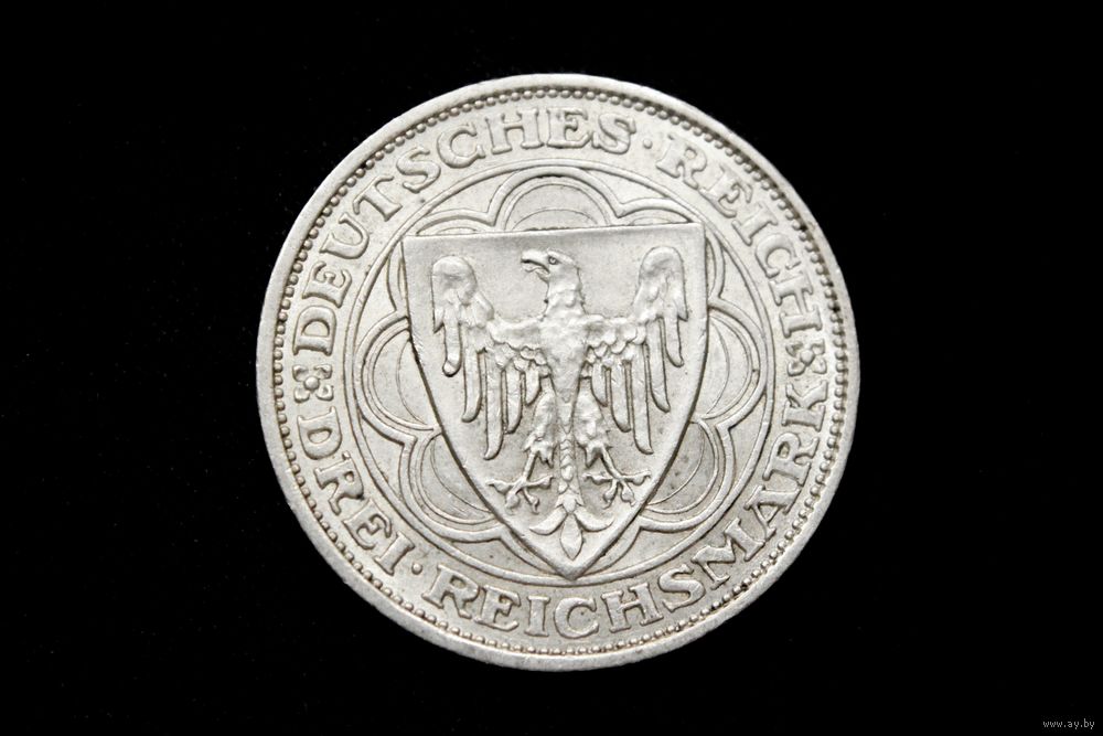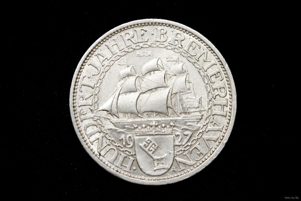 3 марки (рейхсмарки) 1927 г. Веймарская республика (Германия), Пауль фон Гинденбург. "100 лет Бремерхафену". Штемпельный блеск!