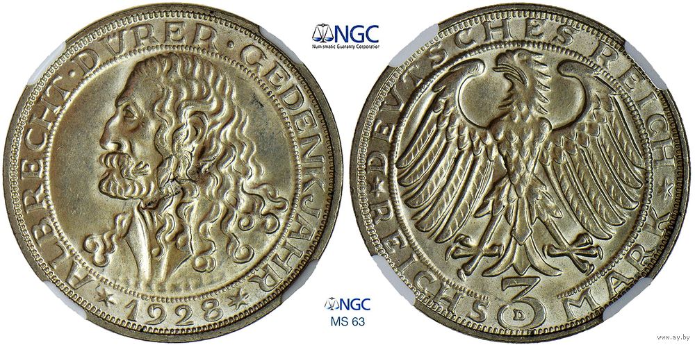 3 рейхсмарки 1928 г. D. Веймарская республика. Германия. 400 лет со дня смерти Альбрехта Дюрера. Серебро. Очень редкие. 50 тыс. шт. Редкая монета в превосходном коллекционном состоянии. Монета в слабе NGC, сохранность MS 63. Краузе #58.