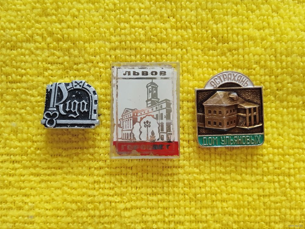 3 значка категории "Города" - "Riga / Рига", "Львов * горсовет", "Астрахань * Дом Ульяновых"