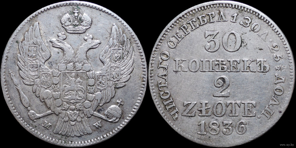 30 копеек / 2 злотых 1836 MW, Отличная! С 1 Рубля! Смотрите другие лоты!