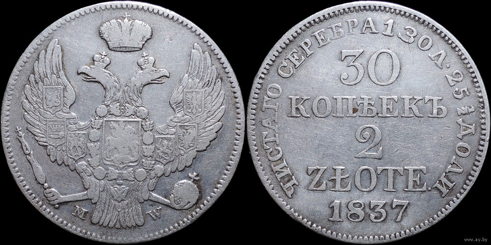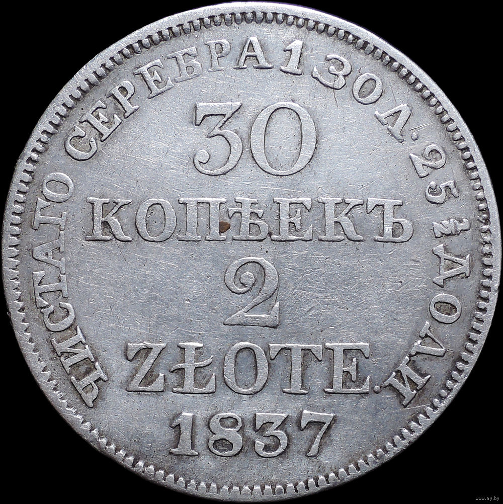 30 копеек / 2 злотых 1837 MW, Отличная! С 1 Рубля! Смотрите другие лоты!