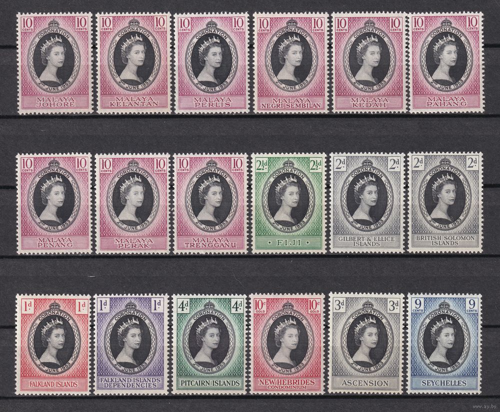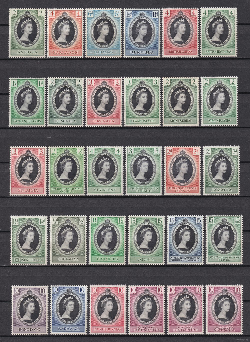 4.BrKS. Великобритания. Колонии. Коронация Елизаветы II. 1953 г. Полная серия. 62 шт. (* - описание).