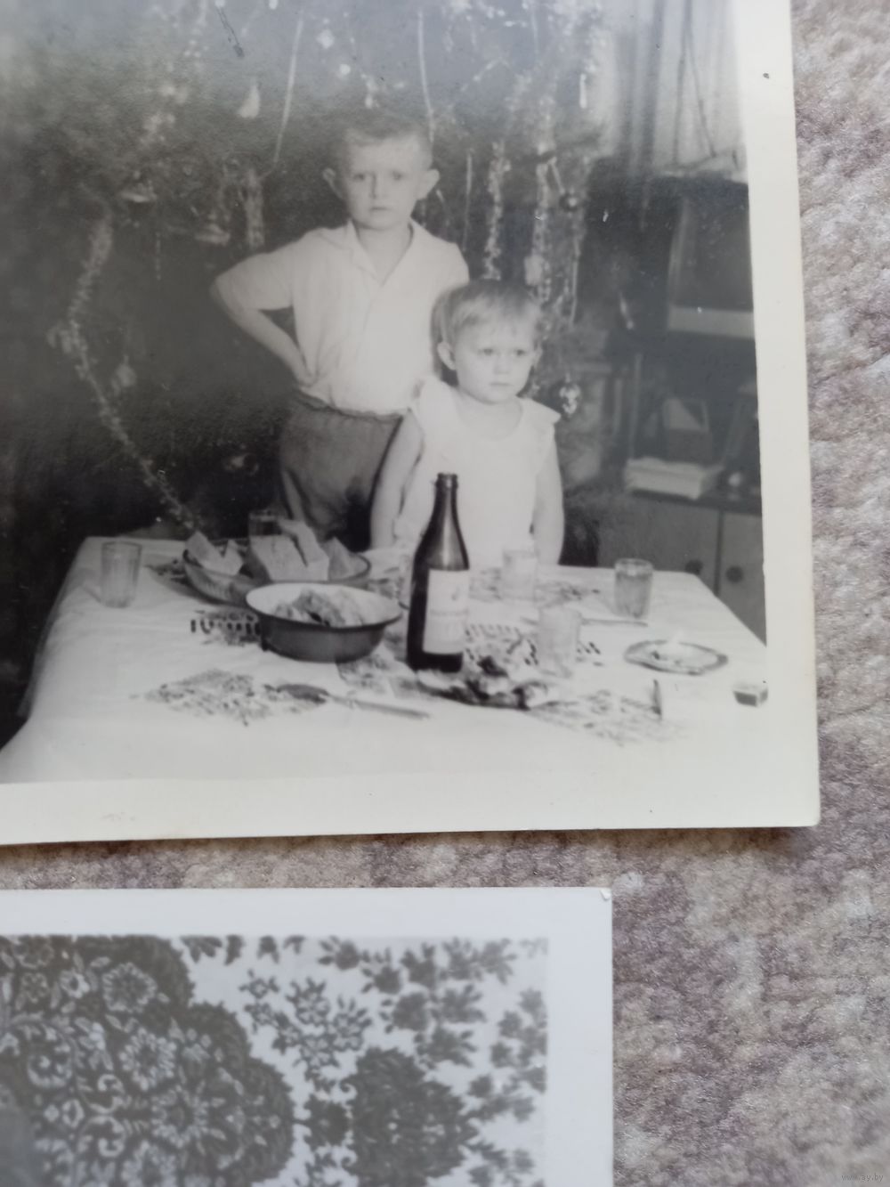 4 фота з дзецьмі і пляшкай партвэйна на стале.