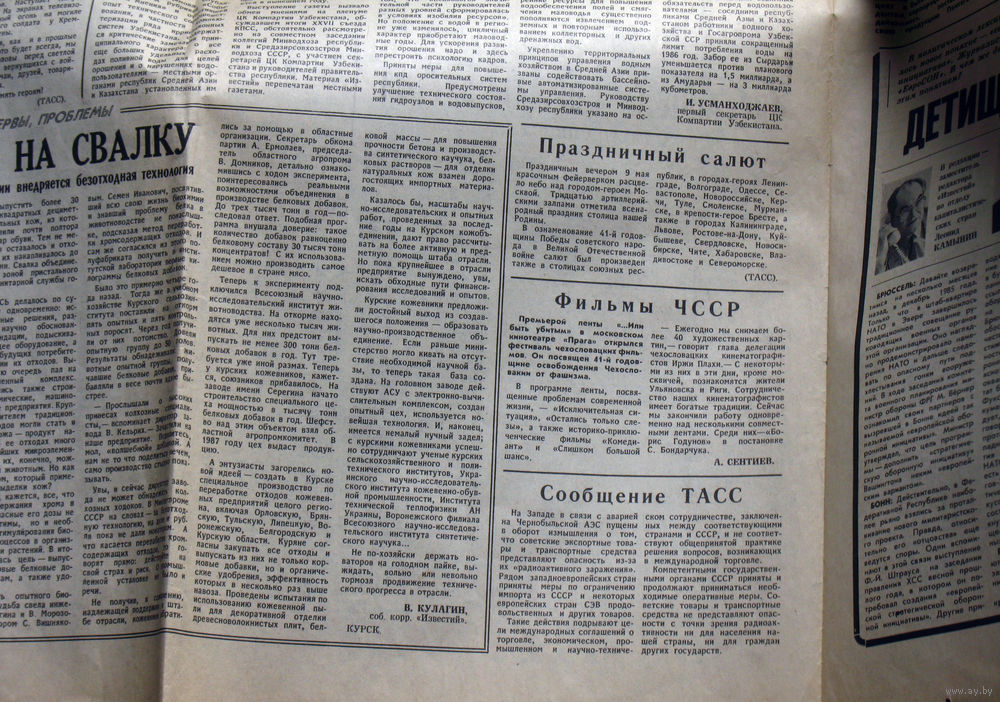 | видно на фото Сообщение ТАСС. На Западе в связи с аврией на Чернобыльской АЭС пущены в оборот измышления о том, что советские экспортные товары и транспортные средства представляют опасность из-за их | |