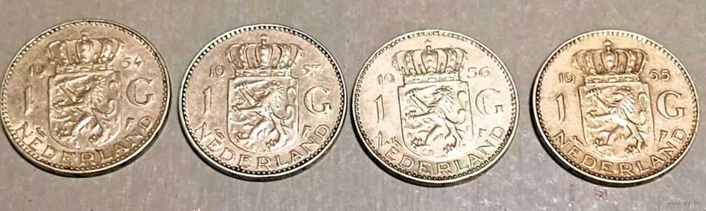 Лот монет, 4 гульдена 1954-1957, Нидерланды, Юлиана, вес монеты 6,5г (общий вес 26г), погодовка в состоянии и блеске, интересная подборка для коллекции и отличная инвестиция! Продаются практически по цене металла!