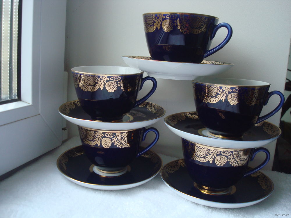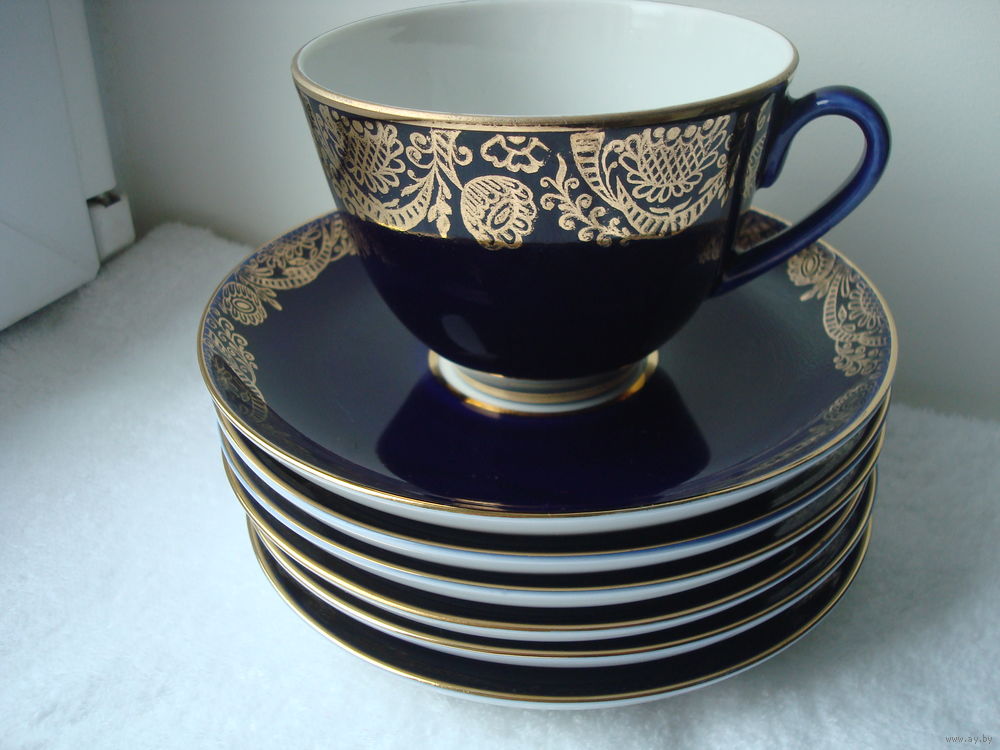 5 чайных пар (чашка и блюдце) "Версаль" со знаком качества. Кобальт ЛФЗ СССР. Люкс.Продажа поштучно.