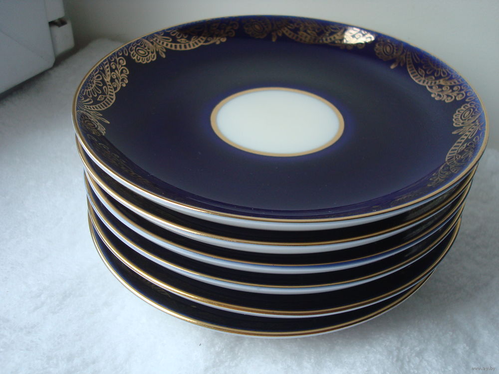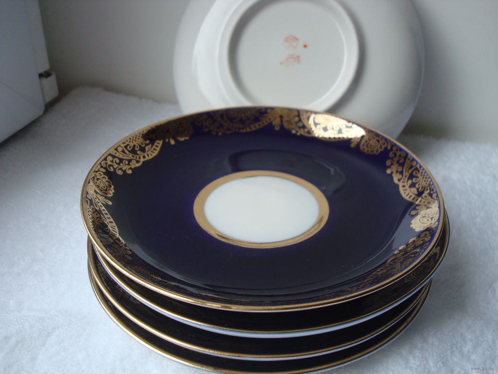 • 5 чайных кобальтовых пар "Версаль" с надписью золотом  ЛФЗ  СССР в отличном состоянии. Витринное хранение. Вся позолота на месте.