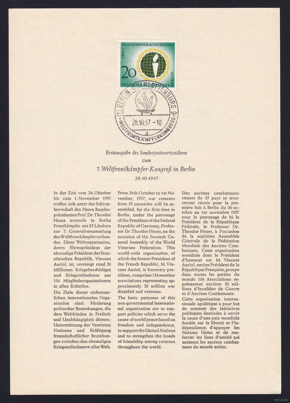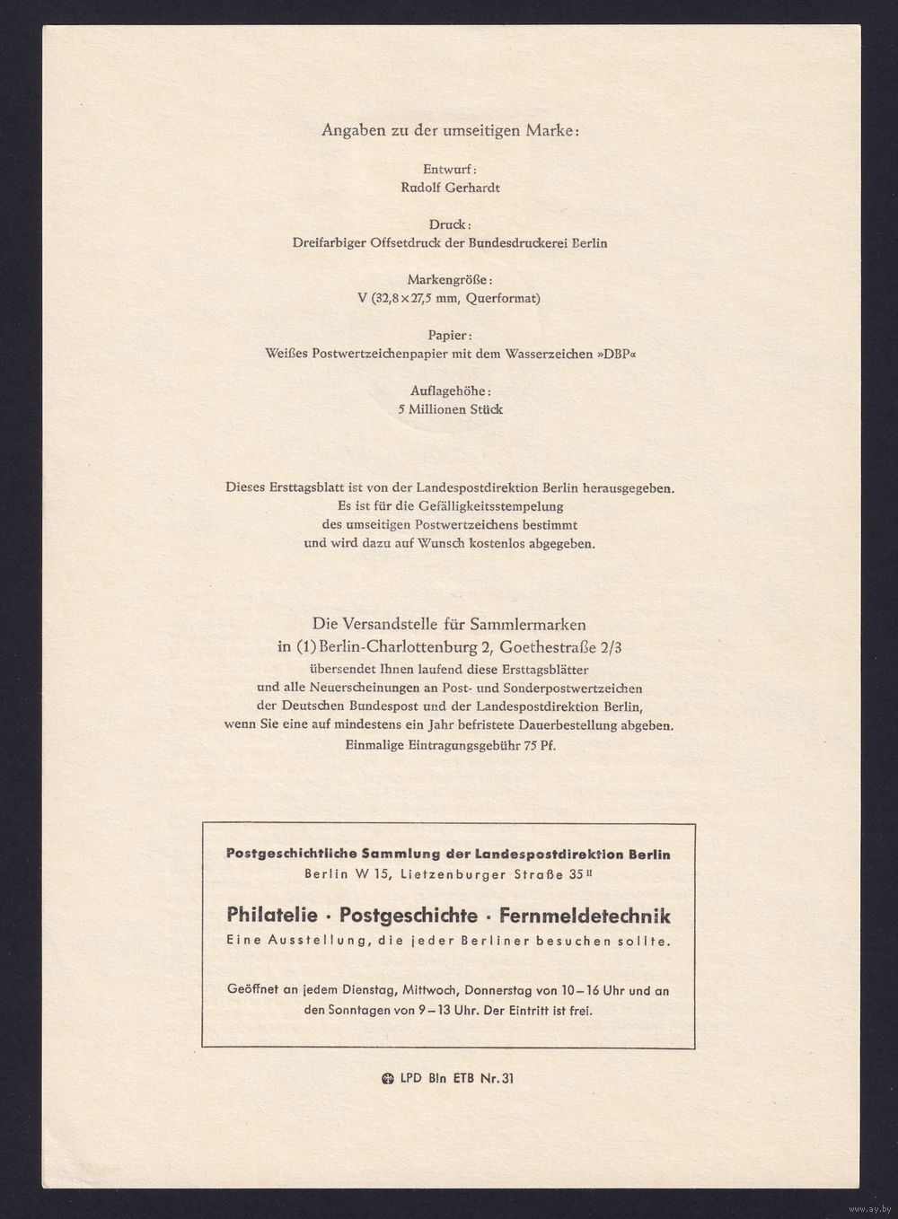 5.ETB. Германия. Западный Берлин. 1957 г. Лист первого дня гашения. Mi.#177/ETB#31.