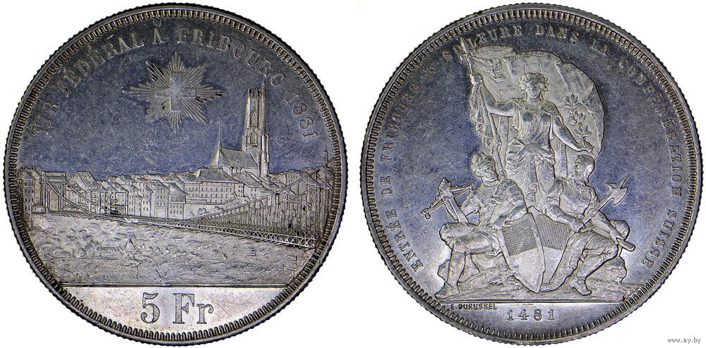 5 франков 1881 г. Стрелковый фестиваль во Фрибуре. Швейцария. Отличное коллекционное состояние, зеркальные поля, штемпельный блеск. Очень редкие. Краузе X# S15