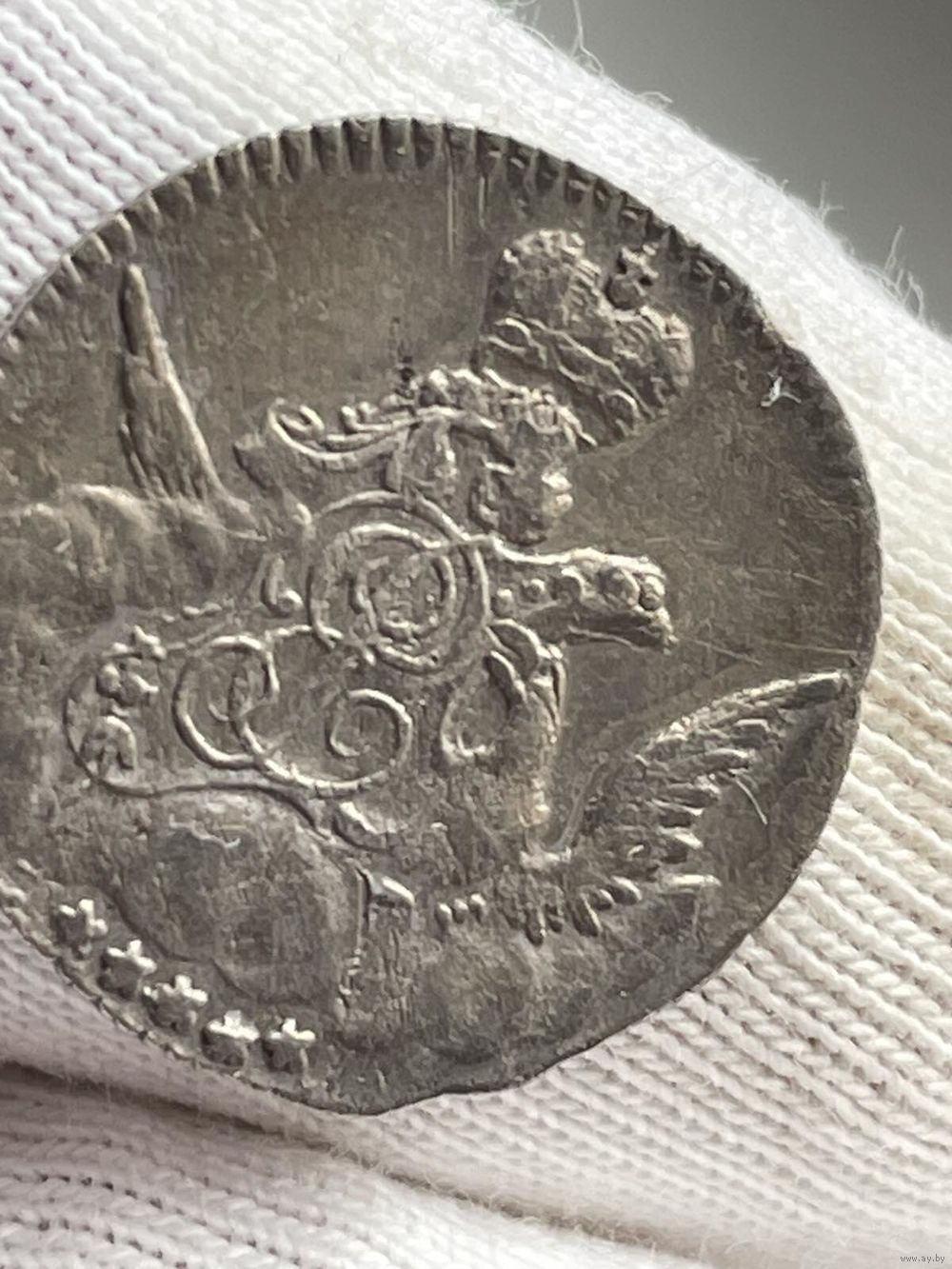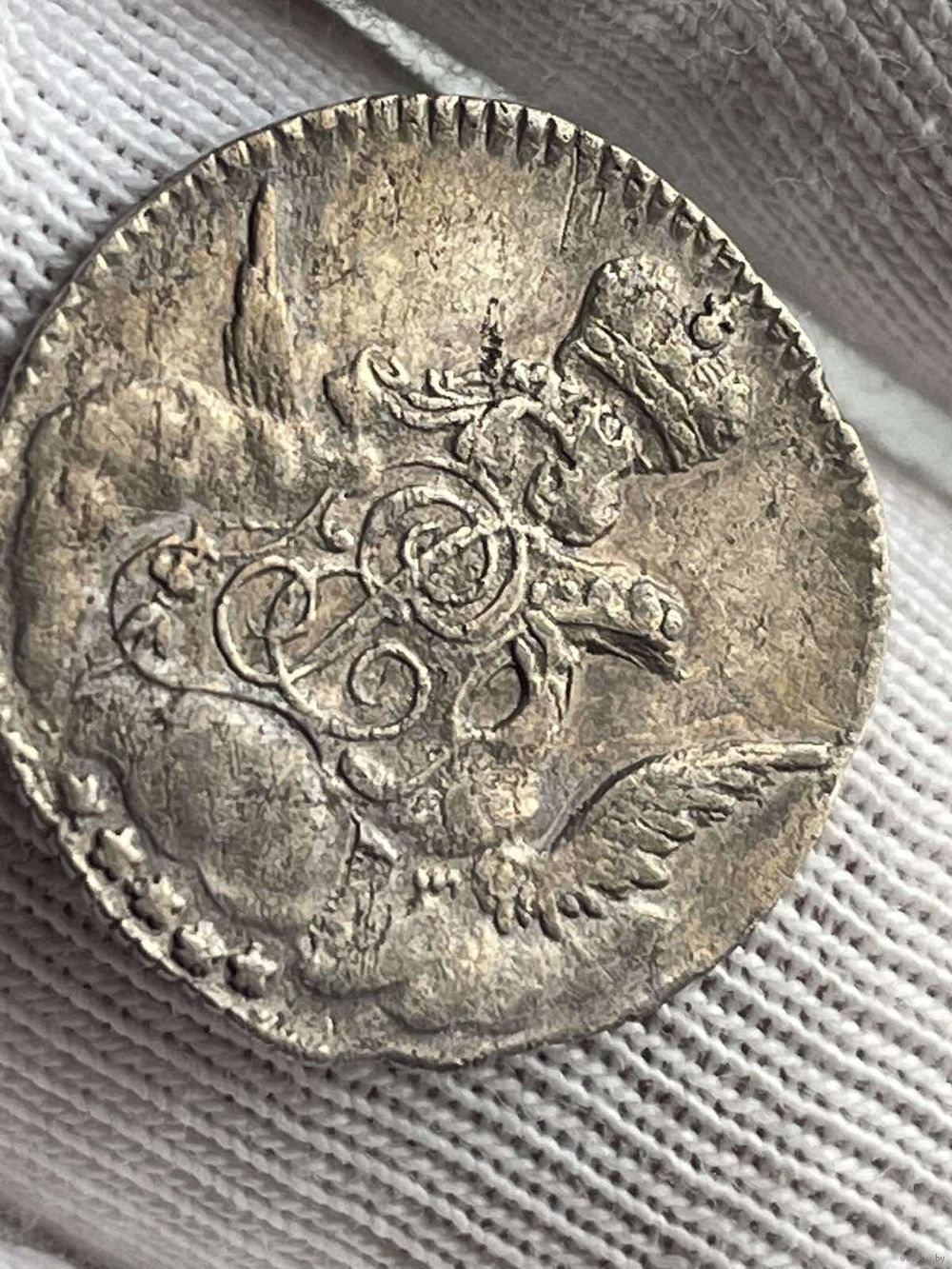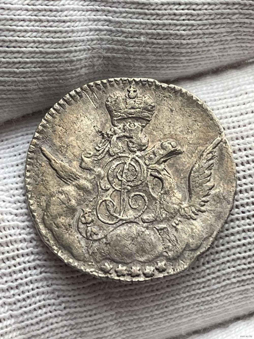 Аверс: в центр орел с распростертыми крыльями в облаках, на левом крыле узорчатый щит с изображением вензеля Елизаветы I «EP» (Елизавета Петровна), вверху императорская корона, под облаком полукругом изображены пять звезд.