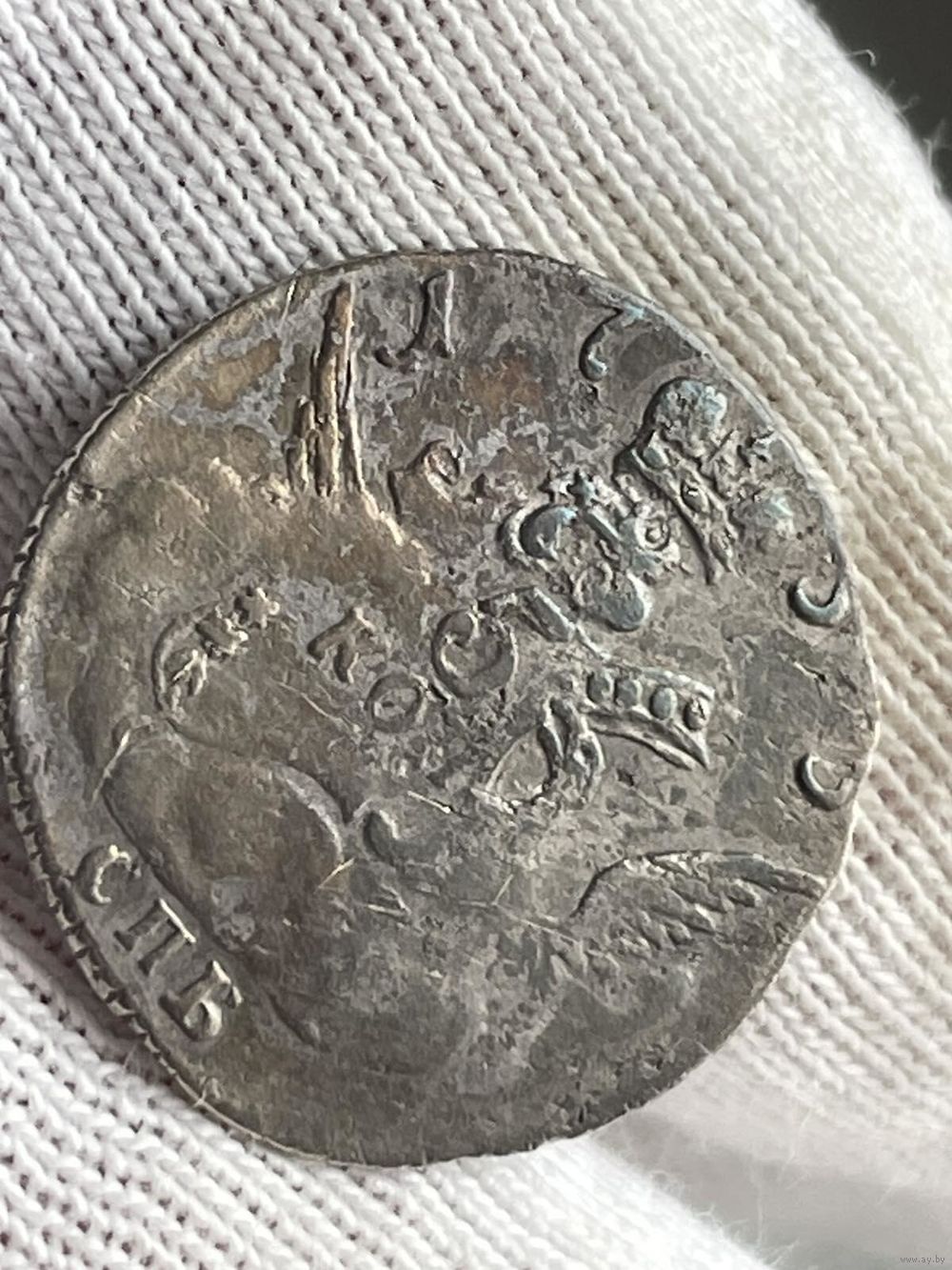 Реверс: в центре орел с распростертыми крыльями в облаках, на правом крыле узорчатый щит, на котором изображен номинал «5», ниже надпись «КОП» (5 копеек). Над облаком – императорская корона, выше – год чеканки «1755», под облаком – обозначение монетного двора «СПБ» (Санкт-Петербургский).