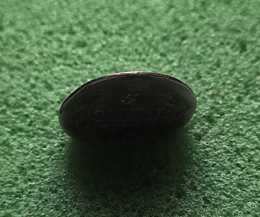 Перед нами монета 5 копеек, выпущенная в 1815 году Санкт-Петербургским монетным двором (СПБ), в 1815 году введена в обращение.