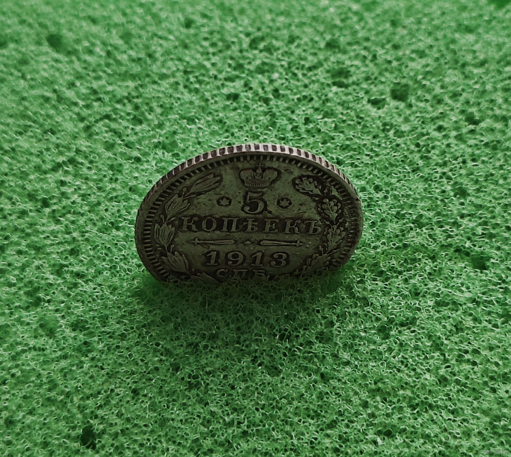 Перед нами монета 5 копеек, выпущенная в 1913 году Санкт-Петербургским монетным двором (СПБ), в 1913 году введена в обращение.