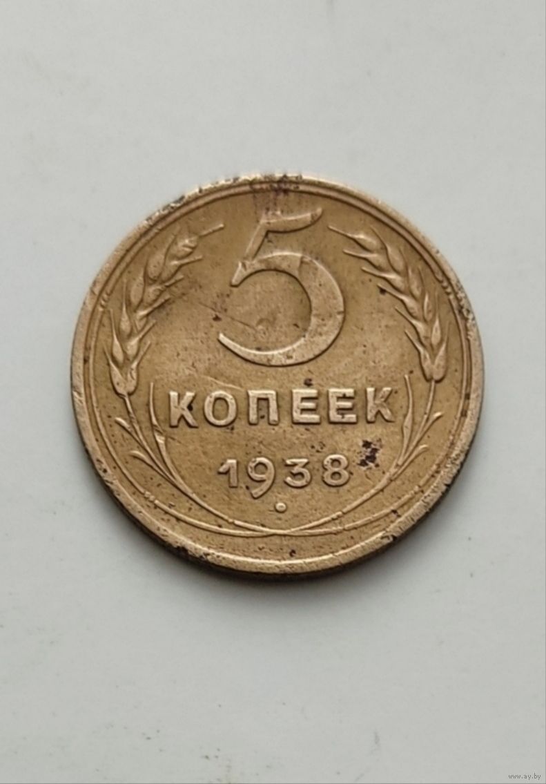 5 копеек 1938 года СССР, не частая, монета в родной патине, не чищена.