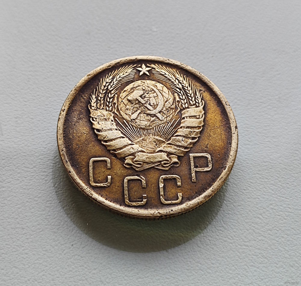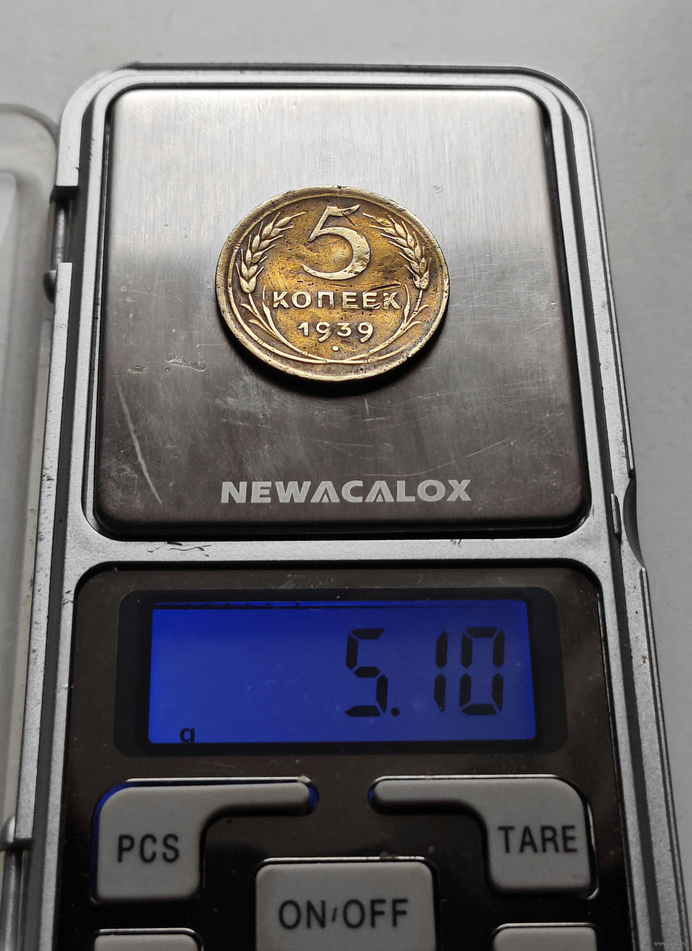 Перед нами монета 5 копеек, выпущенная в 1939 году, в 1939 году введена в обращение.