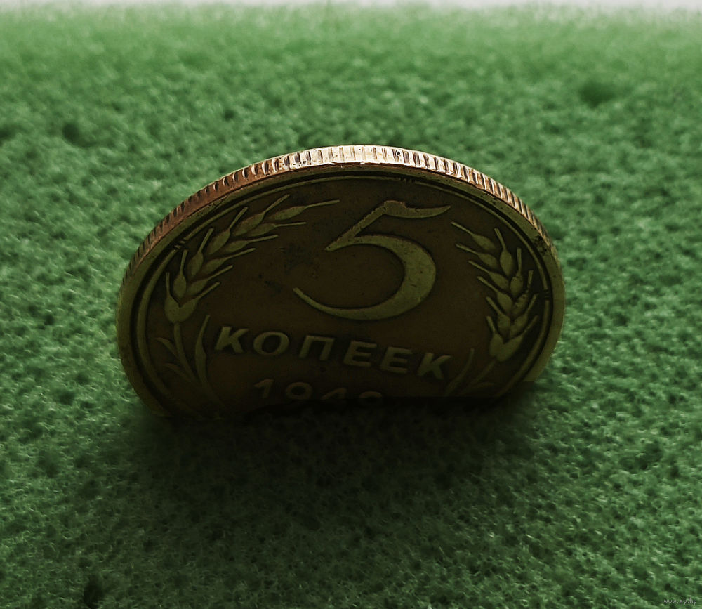 Перед нами монета 5 копеек, выпущенная в 1949 году, в 1949 году введена в обращение.