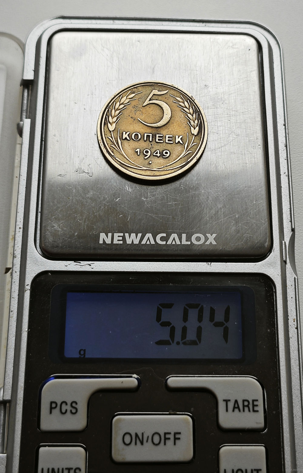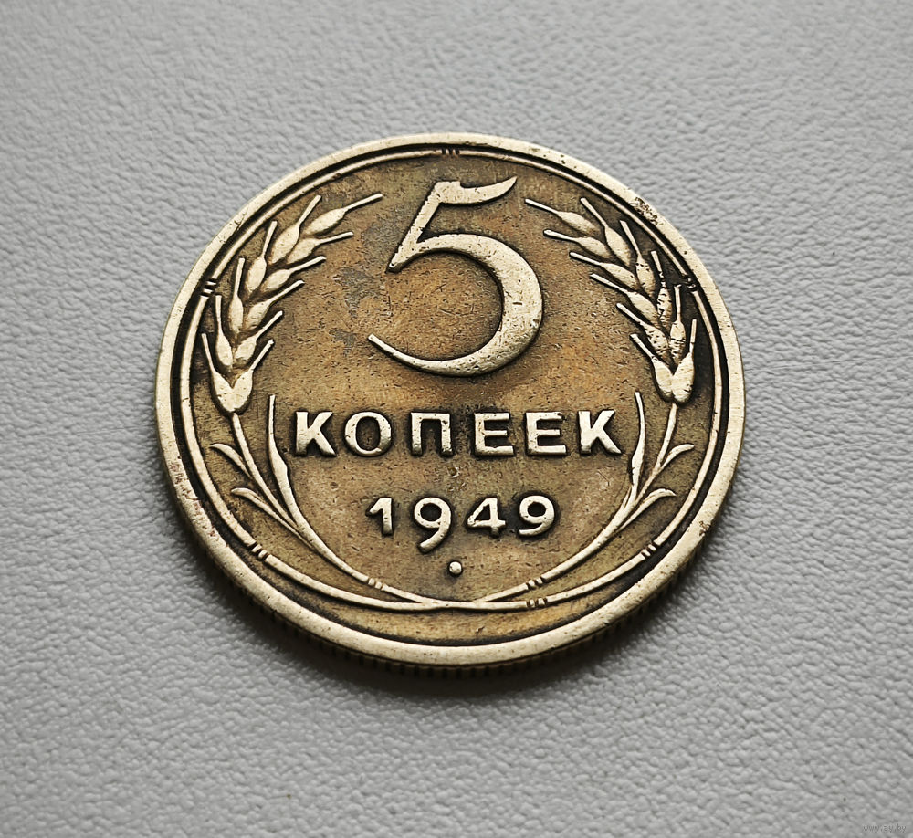 Перед нами монета 5 копеек, выпущенная в 1949 году, в 1949 году введена в обращение.