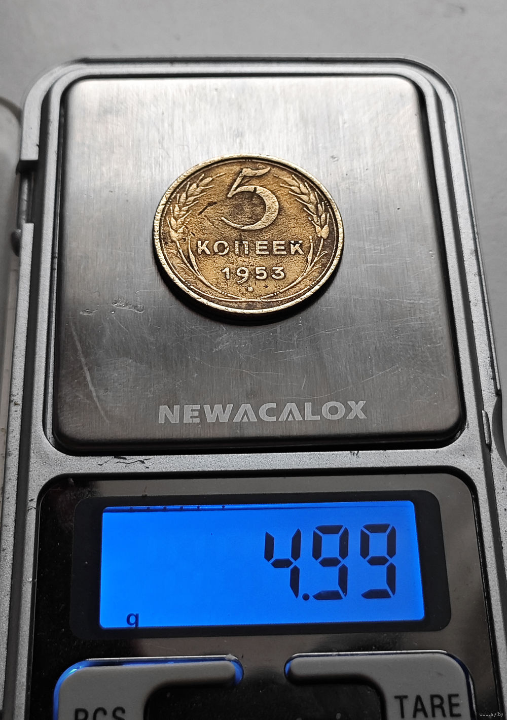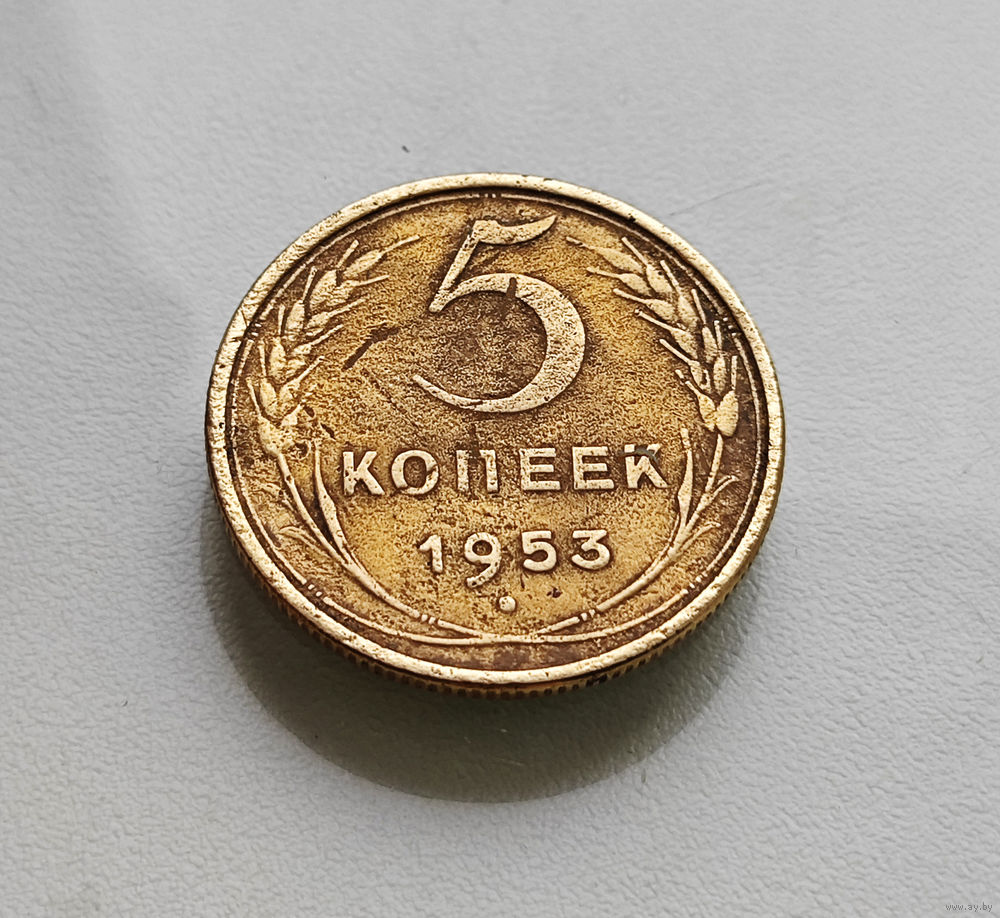 Перед нами монета 5 копеек, выпущенная в 1953 году, в 1953 году введена в обращение.